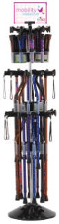 * Sold by display * Dimensions: 16" w x 68"h x 16" * Includes 20 adj. designer aluminum canes * 10 adjustable aluminum designer folding canes * Free standing or wall mounted option * Canes that are included * Offset Canes * 1070PC-purple checkers * 1070CF-camouflage * 1070RS-roses * 1070GP-green plaid * 1070PB-purple bliss * Folding canes * C3010BK-black * C3010BR-bronze * C3011-white & blue flowers * C3022-butterflies * C3023-blue waves * Straight Canes * 2014-lilacs & green leaves * 2028-leopard * 2033-mahogany swirl * 2034-walnut grain * 2037-purple bliss