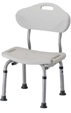 * Packaged: 2/cs;sold by case * MSRP: $89.95/each * HCPCS code: E0245 * Back is removable & has 2-position adjustments * Large contoured back for extra comfort * Has slots for hand held shower * Overall dimensions: 17.5"w x 18.5"d * Seat dimensions: 19.75"w x 13"d * Seat height: 14"-20" * Unit weight: 5lbs. * Height adjust: 15"-21.5" * Seat dim: 19"w x 11"d * Wt cap: 300lbs.