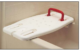 * Packaged & sold by each * MSRP: $159.95/ea * Wall mounted shower seat * Mounts directly to shower wall * Saves space by folding up when not in use * Weight cap: 250lbs. * Seat height: 18.5" * Width folded: 5" * Seat dimensions: 16"w x 16"d * Overall dimensions: 16"w x 16"d