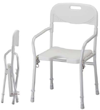 * Packaged & sold by each * MSRP: $169.95/ea * HCPCS code: E0240 * Ideal for travel * Folds & unfolds in seconds * Horseshoe design seat for hygenic purposes * Wt. cap: 250lbs. * Unit weight: 9lbs * Width between arms: 19" * Seat height: 18"-21" * Seat dimensions: 16"w x 15.75"d * Overall dimensions: 21"w x 21"d * Width folded: 6"