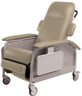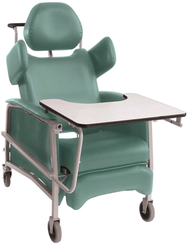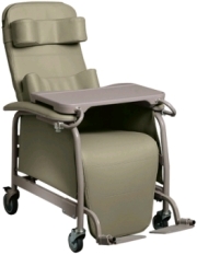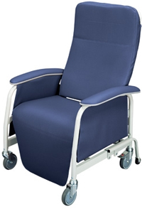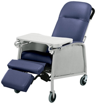 * Packaged & sold by each * MSRP: $532.00/ea * HCPCS code: E1031 * Color: Imperial Blue * The 574G recliner adjust into any one of the 3 easily attained positions,sitting,TV,full recline * The position lock allows caregiver to secure the chair in any position * The Flex-O-Lator seat increases patient comfort by reducing risk of "bottoming out" * The blow molded table can be locked into position or left unsecured for easy exit * Max weight cap: 250lbs. * Features: 3 positions,Position lock,Flex-o-Lator seat,Welded heavy-duty frame,New blow-molded table * Overall height: 47" * Overall width: 25" * Overall depth: 41" * Width between arms: 20" * Arm height from floor: 26" * Arm height from seat: 9" * Seat height: 21" * Seat width: 19" * Seat depth: 19" * Caster size: 5" * Limited 2yr warranty on frame * Upholstery limited 1yr warranty * All other components limited 1yr warranty