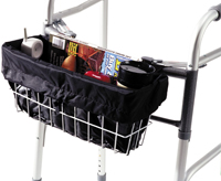 * Sold by each * MSRP: $13.95/ea * HCPCS CODE: N/A * Color: Black * Made of nylon * Dim: 16" x 6" x 7" * Offers privacy & prevents small items from falling through * Features a handy zippered pocket to store personal items,plus dual expandable pouches to hold beverage,cell phone,etc. * Includes an adjustable drawstring to fit most baskets
