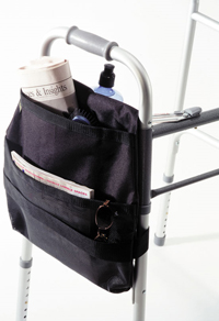 * Sold by each * MSRP: $29.75/ea * HCPCS CODE: N/A * Side mount * Color: Black * Made of nylon * Dim: 14 1/2" x 15" x 2 1/2" * A necessity for every walker! * Features detachable beverage holder & generously sized pockets to allow access to personal items * Universal fit for most walkers