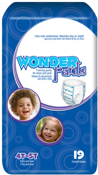 * Packaged 4bgs of 19;76/cs * Sold by case * Size: 4T-5T(X-Large) * Patient wt: 35+lbs. * Color: White * Designed w/Dri-Guard for leakage protection & tear away sides * WonderPants feel & fit like regular underwear * Designs fade when wet to help w/potty training * Soft Cloth-like outer fabric,inner leg cuffs,elastic waistband * Breathable zones