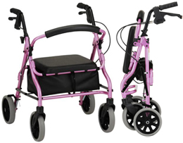 * Sold by each * MSRP: $198.95/ea * HCPCS codes: Walker: E0143 Seat: E0156 * Color: Pink * Wt. cap: 300lbs. * 8" wheels * 18" seat height * Unit wt: 15.5lbs. * User height: 4'10"-5'4" * Seat dim: 13.5"w x 12.5"d * Handle ht adj: 28"-31.25" * Pouch dim: 9"l x 15"w x 6.5"d * Width btw handles: 17.5" * Overall dim: 24.5"w x 25"d * Overall folded dim: 34"l x 24.5"w x 10.5"d * Locking hand brakes * Large padded seat * Under seat pouch * Flip-up back * Accessory options: travel bag,cup holder,flashlight attachment, & designer mobility bags