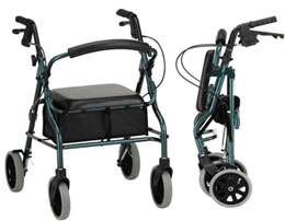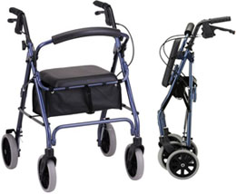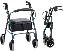 * Sold by each * MSRP: $198.95/ea * HCPCS codes: Walker: E0143 Seat: E0156 * Color: Blue * Wt. cap: 300lbs. * Overall weight: 16.5lbs. * User height: 5'5"-6'1" * Handle hgt adj: 31.5"-36" * Width btw handles: 17.5" * Seat height: 22" * Overall dim: 24.5"w x 26"d * Overall folded dim: 36"l x 24.5"w x 10.5"d * Locking handbrakes * Large padded seat * Under seat pouch * Flip-up back * 8" wheels * Accessory options: Travel bag,cup holder,flashlight attachment,designer mobility bags * Warranty: limited lifetime on frame,5 yrs. on handbrakes & 1yr on parts