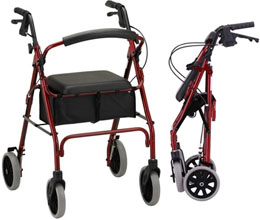 * Sold by each * MSRP: $198.95/ea * HCPCS codes: Walker: E0143 Seat: E0156 * Color: Red * Wt. cap: 300lbs. * Overall weight: 16.5lbs. * User height: 5'5"-6'1" * Handle hgt adj: 31.5"-36" * Width btw handles: 17.5" * Seat height: 22" * Overall dim: 24.5"w x 26"d * Overall folded dim: 36"l x 24.5"w x 10.5"d * Locking handbrakes * Large padded seat * Under seat pouch * Flip-up back * 8" wheels * Accessory options: Travel bag,cup holder,flashlight attachment,designer mobility bags * Warranty: limited lifetime on frame,5 yrs. on handbrakes & 1yr on parts