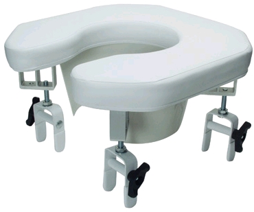 * Packaged & sold by each * MSRP: $145.00/ea * HCPCS code: E0244 * Wt. cap: 300lbs. * Unique open seat promotes patient independence & facilitates perineal cleaning & bowel training * Front opening is 4 3/4" wide * Seat can be rotated to from front to either side or rear mounting for maximum access to perineal area * Thick, heat-sealed padded seat is ideal for patients w/circulatory problems or patients who need additional comfort * Angel & height are adjustable to maximize comfort & reduce bending & patient effort required * Comes complete w/4 heavy duty VersaGuard coated locking brackets * Fits most toilets * Lifetime limited warranty * Seat width: 16" * Seat depth: 16" * Seat height range: 6"-7 1/2"