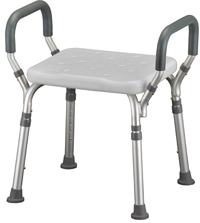 * Sold by each * MSRP: $89.95/ea * Wt. cap: 300lbs. * Seat adjustments: 16"-21" * Easy tool-free assembly of back,seat & legs * Arms provide added stability when sitting and rising * Provides comfortable seating while bathing * Blow molded bench provides comfort & strength * Aluminum frame is lightweight,durable & corrosion proof * Ht adjustable,angled legs w/suction style tips provide additional stability
