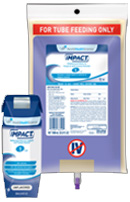 * 24-250 mL cartons/case * Sold by case * Unflavored * HCPCS code: B4154 * 250 calories * Impact nutritionally complete liquid formula is specialized medical nutrition for surgical & trauma patients * Each member of the Impact family of products has a unique & patented formula that has been demonstrated in clinical trials to improve patient outcomes * In clinical trials,patients who received an Impact formula developed fewer infections & had shorter hospital stays than those patients fed standard enteral formulas * Protected by NutriShield-a proprietary combination of microbial inhibitors protecting from harmful bacteria,especially in open system * Appropriate for these diets:lactose-free,low-residue,non-kosher