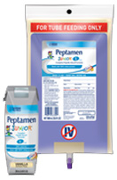 * 24-250 mL cartons/case * Sold by case * Flavor: Vanilla * HCPCS code: B4153 * 375 calories * Appropriate for lactose-free,gluten-free,low-residue,low-cholesterol * High caloric density to address nutritional needs in smaller volume * Balanced peptide profile to support nitrogen absorption & utilization * 100% whey-based to facilitate gastric emptying * High MCT level to decrease potential for fat malabsorption * Peptamen contains ingredients (i.e. partially hydrolyzed whey protein, from cow's milk protein) that may not be appropriate for individuals w/food allergies * Application: complete tube feeding or oral supplementation w/flavor packets