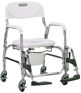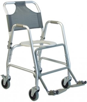 * Sold by each * MSRP: $279.95/ea * HCPCS code: E0163 * Pail can be removed w/o lifting patient or raising seat * Waterfall armrests * 4" swivel whls w/4 locking casters * Pail & lid included * Seat Height: 19.5" * Overall Width: 21" * Width between arms: 17.5" * Weight Capacity: 250lb. * Made of aluminum * Padded seat * Pail can be removed from the back