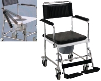 * Sold by each * MSRP: $299.95/ea * HCPCS codes: Commode: E0165 Footrest: E0175 * Collapsable * Padded seat fits over commode & converts into transport chair * Swing away footrests (removable) * Drop-arm allows for easy patient transfer * 4" locking whls * Pail,lid & padded seat included * Pail can be removed w/o lifting patient or raising seat * Seat height: 19" * Overall width: 22" * Width between arms: 18" * Weight cap: 250 lbs. * Gray pail