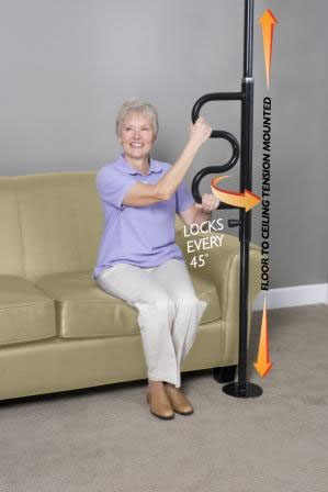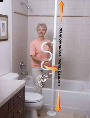 * Packaged & sold by each * MSRP: $209.99/ea * 2 products in 1: Floor to ceiling pole w/pivoting Curve Grab Bar that locks in place every 45" * Adjustable: Fits ceiling hts 7'-10' * Portable: Main pole easily separates into 2 53" pieces making it easy to transport * Adaptable: No need for wall mounts;can be installed in virtually any area of a room exactly where it's needed * Wt. cap: 300lbs. * Unit wt: 20lbs. * Rust resistant Zinc plated steel
