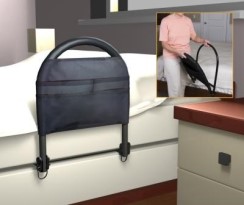 * Packaged 4/cs * Sold by each * MSRP: $99.99 * Ergonomic no-slip handle-allows for easy transfer in & out of bed * 4-pocket organizer included-Prevents entrapment & provides storage space for handy items * Folds for travel & storage * Safety strap secures rail to any home or hospital bed * Wt. cap: 350.lbs. * Rail adjustment ht: 19"-22" * Rail width: 15" * Base dimensions: 23"-19" * Unit wt: 12lbs. * Installs w/safety pins