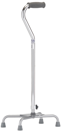 * Packaged: 2 per cs;sold by case * Break case charge: $7.50 * MSRP: $25.95/ea * HCPCS code: E0105 * Large base * Color: Silver * Lightweight design & low center of gravity combine for greater stability & balance * The offset handle rotates for use w/either the left or right hand * Height adjust: 29"-38" * Diameter: 7/8" * 12 1/4" between legs * Wt. cap: 250 lbs. * Replacement handle: P42023 * Unit wt: 2.5 lbs. * Tip size: 50015 * Limited lifetime warranty all other parts 1yr.(Handgrips,straps & tips)