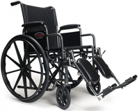 * Packaged & sold by each * 20"w x 16"d * MSRP: $395.00/ea * Elevating leg rest w/full arms * Designed w/dual rear axles & adjustable casters,this w/c can convert from a K0001 Medicare code to a K0002 Medicare code * Black vinyl upholstery * Chart pocket on back * "Tool free" adjustable front rigging * Hammer tone paint provides a long lasting & durable finish * Industry compatible front rigging * 2 position axle & caster fork provides 2" seat height adjustment * Wt. cap: 250lbs. * Seat width: 20" * Seat depth: 16" * Seat height: 18" or 20" * Back height: 15 1/2" * Overall wheel diameter: 31 1/2" * Overall chair height: 35 1/2" * Overall chair width: 28 1/2" * Overall chair width folded: 12" * Unit weight: 40lbs. * 1 yr warranty on sideframes,crossbraces,wheels,handrims,front riggings & forks*6 mo. on upholstered components,plastic parts,painted surfaces,rubber parts,bearings & any other parts not specifically identified above