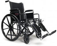 * Packaged & sold by each * 16"w x 16"d * MSRP: $385.00/ea * Elevating footrest w/desk arms * Designed w/dual rear axles & adjustable casters,this w/c can convert from a K0001 Medicare code to a K0002 Medicare code * Black vinyl upholstery * Chart pocket on back * "Tool free" adjustable front rigging * Hammer tone paint provides a long lasting & durable finish * Industry compatible front rigging * 2 position axle & caster fork provides 2" seat height adjustment * Wt. cap: 250lbs. * Seat width: 16" * Seat depth: 16" * Seat height: 18" or 20" * Back height: 15 1/2" * Overall wheel diameter: 31 1/2" * Overall chair height: 35 1/2" * Overall chair width: 24 1/2" * Overall chair width folded: 12" * Unit weight: 40lbs. * 1 yr warranty on sideframes,crossbraces,wheels,handrims,front riggings & forks*6 mo. on upholstered components,plastic parts,painted surfaces,rubber parts,bearings & any other parts not specifically identified above
