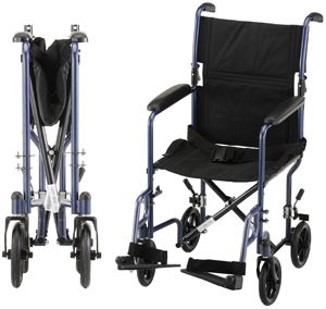 * Sold by each * MSRP: $388.95/ea * Color: Blue * HCPCS code: E1038 * Weight cap: 300lbs. * Lightweight aluminum frame * Flip back desk arms * Quick release fold-down back * Hand brakes & locking rear wheels * Removable aluminum footrests * 8" front wheels & 12" rear wheels * Unit weight: 28lbs. * Width between arms: 19.5" * Arm height from seat: 10" * Back height from seat: 18" * Seat dimensions: 18.5"w x 19.5"h * Overall dimensions: 25.5"w x 38"h * Overall folded dimensions: 30.5"l x 11.5"w x 28.5"d * Optional accessories: Travel bag,flashlight attachment,designer mobility bags,cup holder