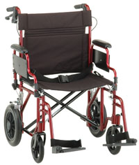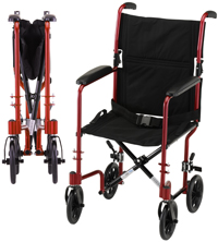 * Sold by each * MSRP: $330.95/ea * Color: Red * HCPCS code: E1038 * Weight cap: 300lbs. * Ultra lightweight aluminum frame * Flip back desk arms * Quick release fold-down back * Locking rear wheels * Removable aluminum footrest * 8" wheels * Overall weight: 23lbs. * Width between arms: 19.5" * Arm height from seat: 10" * Back height from seat: 18" * Seat dimensions: 18.5"w x 19.5"h * Overall dimensions: 25.5"w x 38.25"h * Overall dimensions folded: 30.5"l x 12"w x 26.5"d * Optional accessories: Travel bag,cup holder,flashlight attachment,designer mobility bags