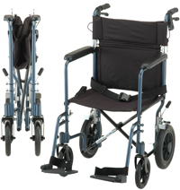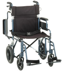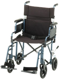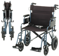 * Packaged & sold by each * MSRP: $157.00/ea * HCPCS code: E1039 * 17" aluminum lightweight transport chair * Color: blue * Features blk,padded nylon upholstery * Foldable back canes for easy storage * IC compatible footrest * Weight of w/c: 20lbs. * Tire width: 37" * Overall height: 37 3/4" * Overall width: 22 3/4" * Overall weight: 20lbs. w/o foot riggings * Warranty: 3yrs on frames & crossbraces