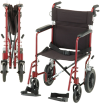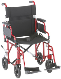 * Sold by each * MSRP: $388.95/ea * Color: Red * HCPCS code: E1038 * Weight cap: 300lbs. * Lightweight aluminum frame * Flip back desk arms * Quick release fold-down back * Hand brakes & locking rear wheels * Removable aluminum footrests * 8" front wheels & 12" rear wheels * Unit weight: 28lbs. * Width between arms: 19.5" * Arm height from seat: 10" * Back height from seat: 18" * Seat dimensions: 18.5"w x 19.5"h * Overall dimensions: 25.5"w x 38"h * Overall folded dimensions: 30.5"l x 11.5"w x 28.5"d * Optional accessories: Travel bag,flashlight attachment,designer mobility bags,cup holder